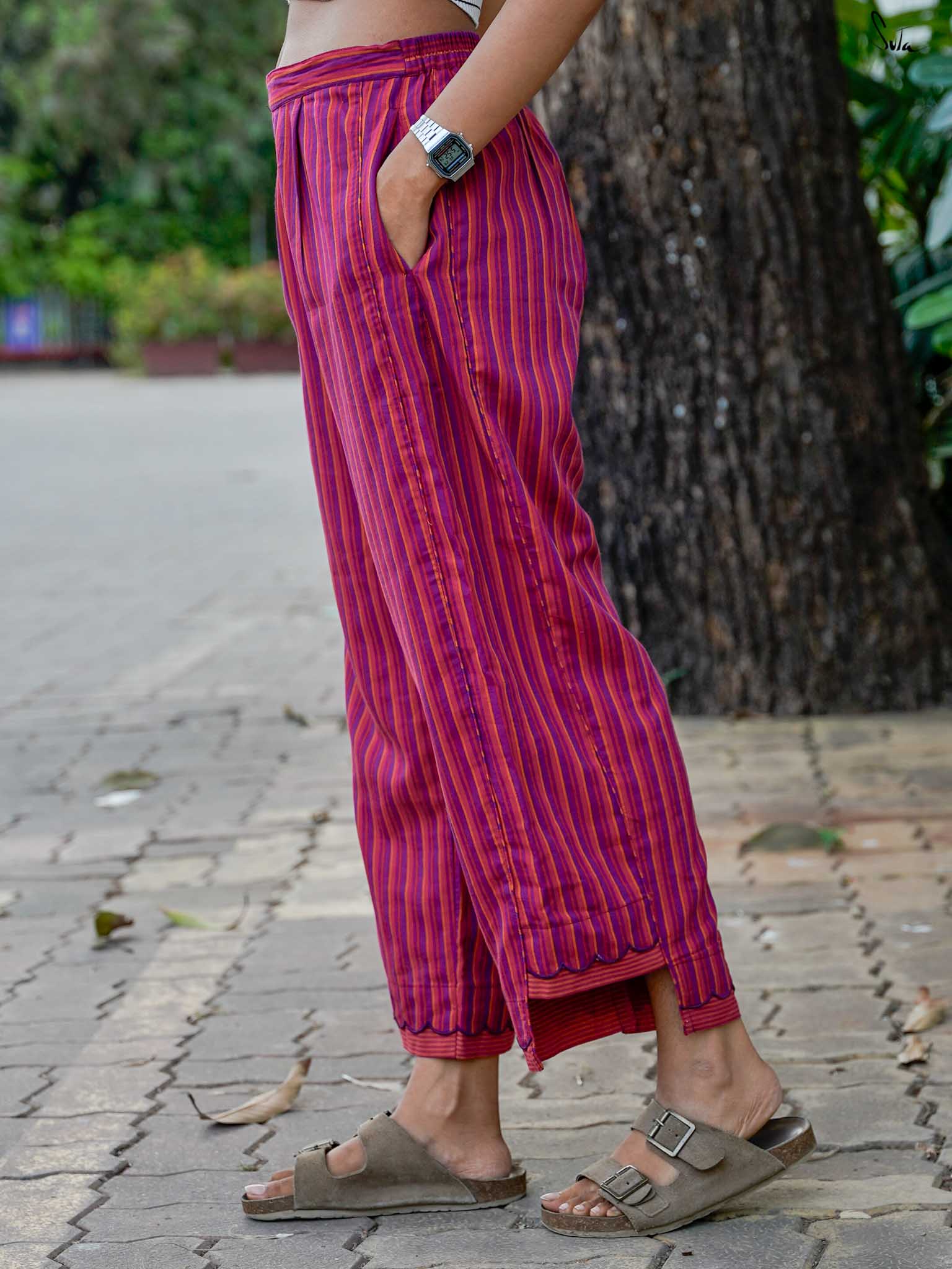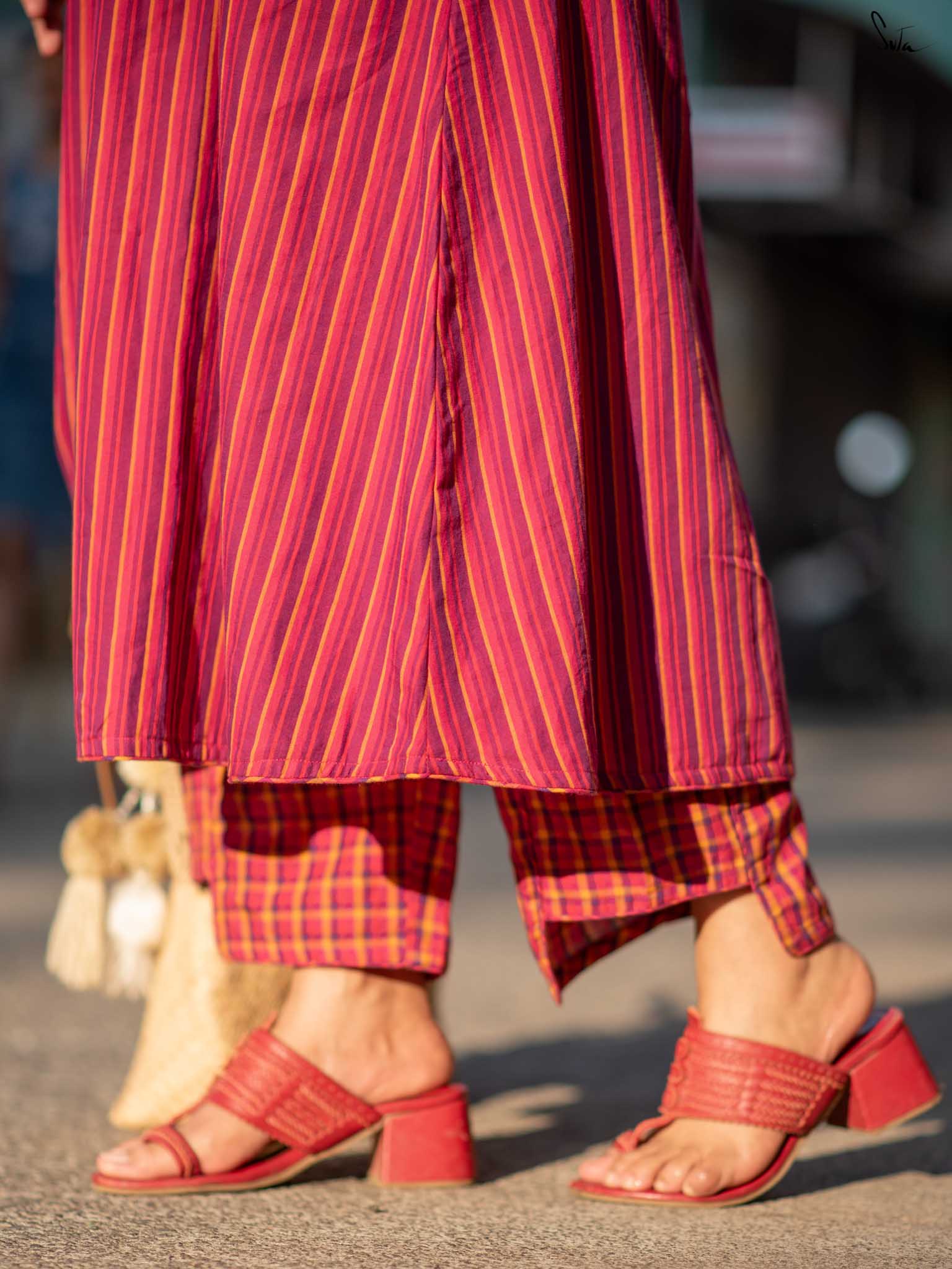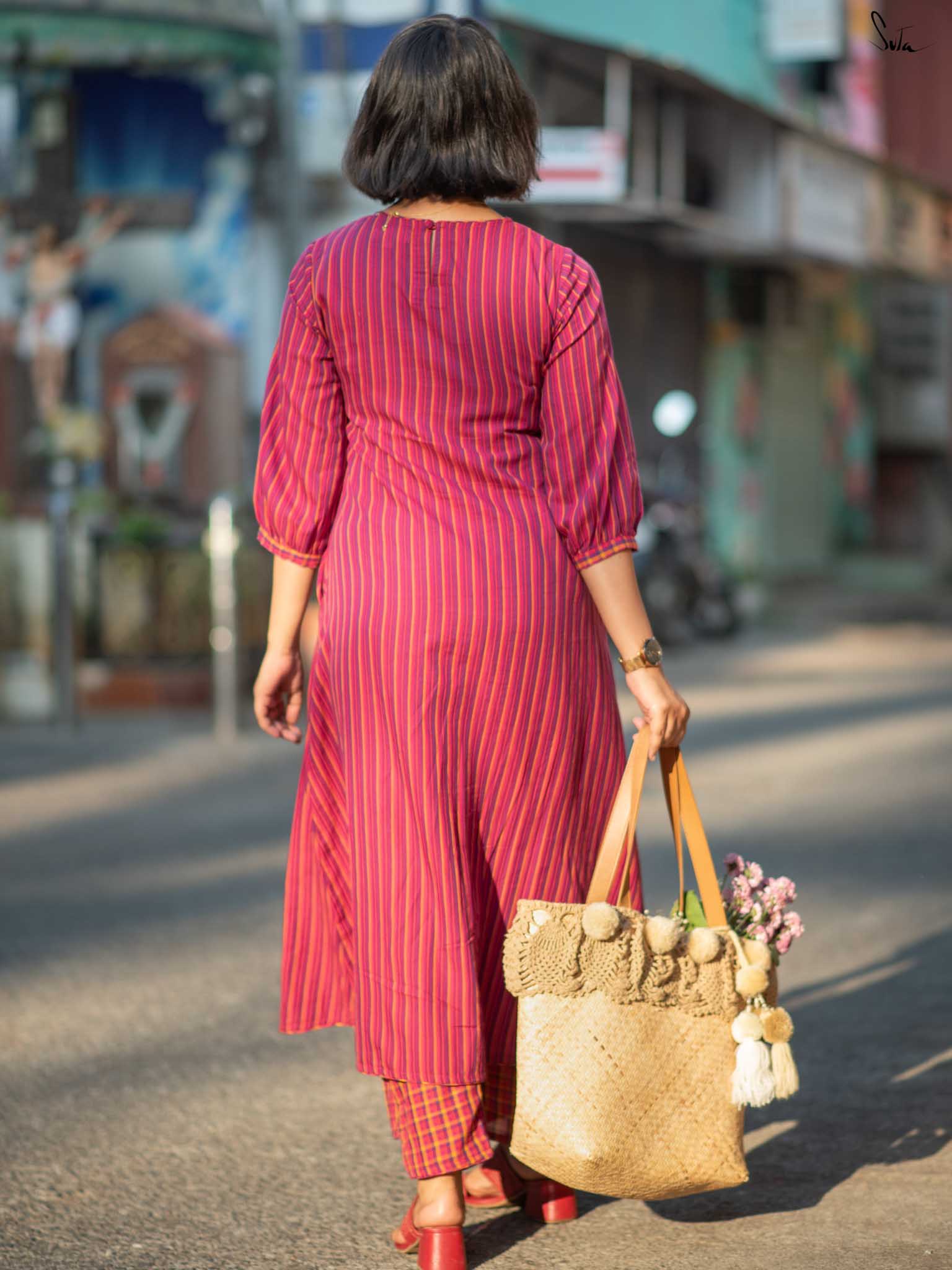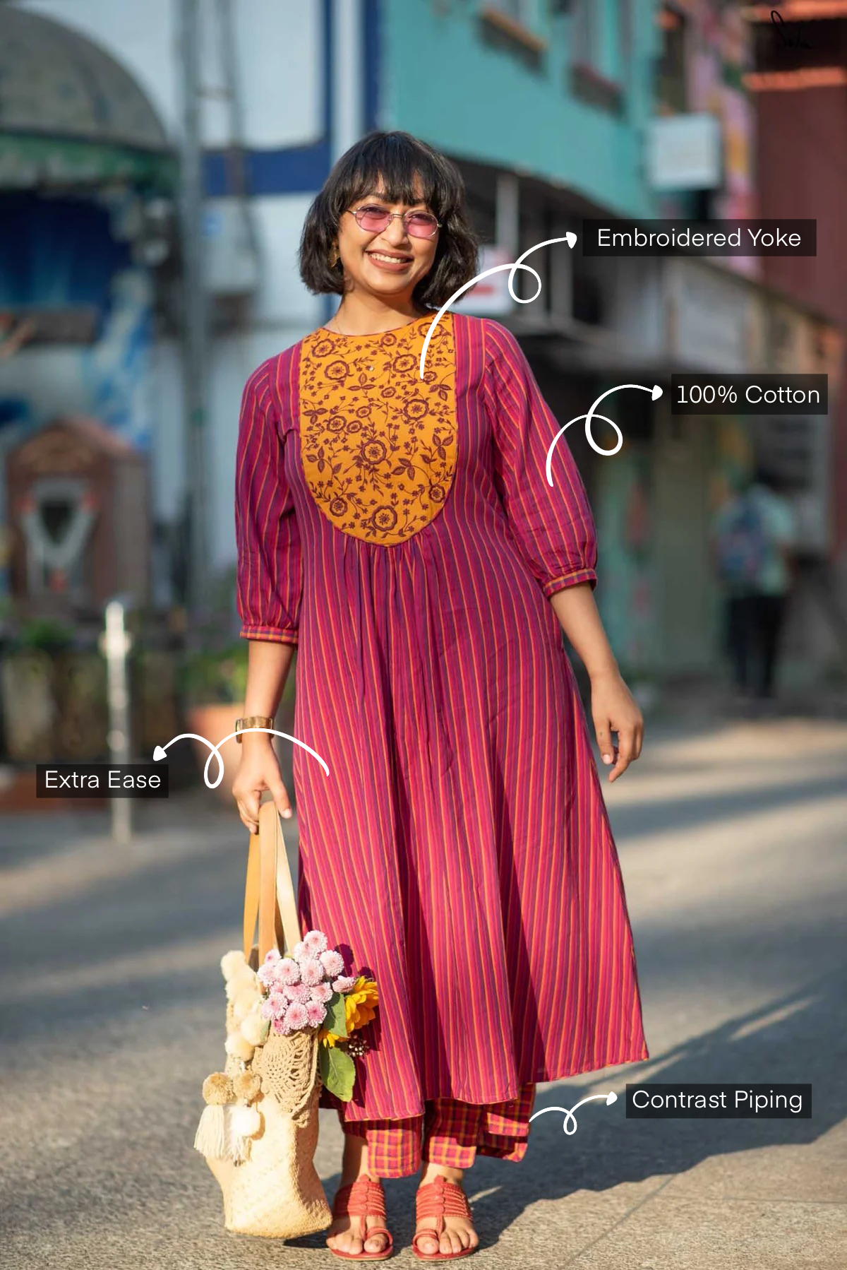 Vibrant, unexpected, and full of spark. This magenta kurta set stitches together playful elements that light up a room. The mustard yoke bursts with floral embroidery, standing out against the woven base. The checkered magenta and mustard pants echo the kurta’s playful contrast, with details that invite both comfort and celebration.